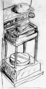 This is the first draft of the forge, penned on the back of some Mech. 350 notes (Yes, I did pass the course, but barely)This "final" conceptual drawing was actually done on the back of my BIOL 111 midterm exam. The design was done here, just needed to be built.Thought I'd try colouring in the sketch and test it out in the game to see how it looked.After many an hour building and animating it, the forge was completed. A few minor revisions in form to make it fit onscreen better took place. Yes, that is an omega when it swings in :)