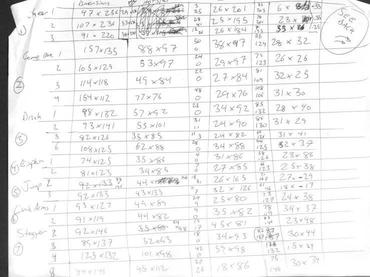 Below is one of the sheets that Elizabeth originally received with requests for animation frames. If nothing else, it gives a pretty clear impression of how she took some things bouncing around in Rob's head and ran with them.