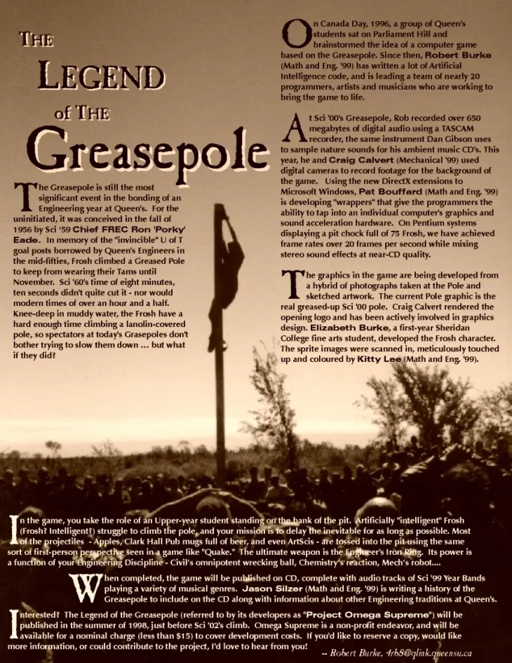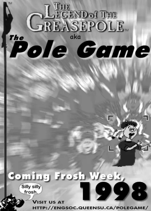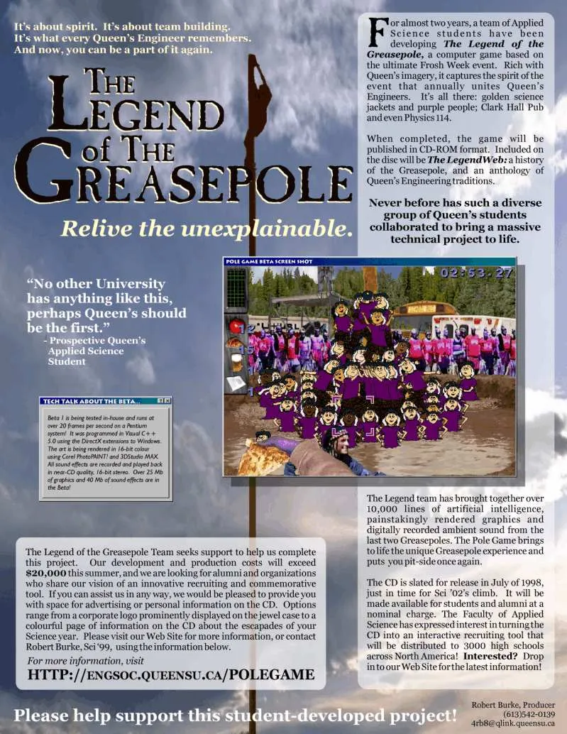 As Kirsten Sorensen's Alumni Centennial group geared up for the EngSoc Centennial, The Legend of the Greasepole team offered Alumni and Corporations another incentive to contribute -- space on the Legend of the Greasepole CD. This, our first full-colour ad, ended up shaping the look of the game. By this point, TetherFrosh (the shadowed guy) had become a permanent fixture in our artwork.