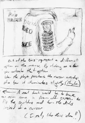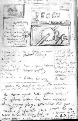 Craig Calvert writes: Here are some of the first draft, conceptual sketches made to help flesh out the look and feel of the PoleGame. Notice how many things in these sketches never came to be, but they helped us to understand where the game was heading.